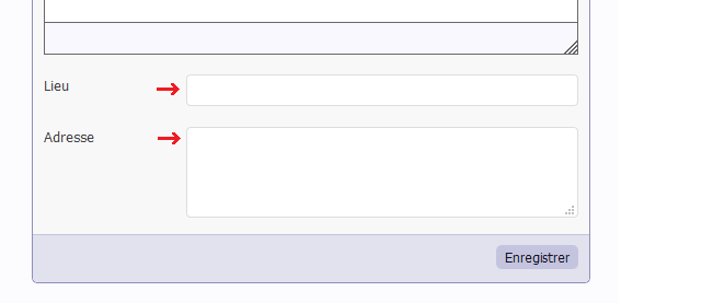 - Renseigner les champs lieu et adresse prévu à cet effet, en bas de votre événement :