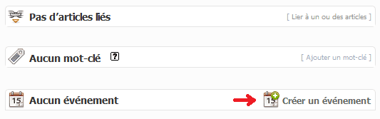- Dans votre article déjà publié (partie rédacteur), cliquer sur [Créer un événement] :