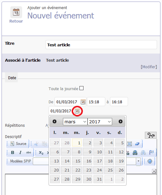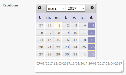 - Cliquer sur [Ajouter] à coté du champ Répétitions et sélectionner les dates concernées dans le calendrier :