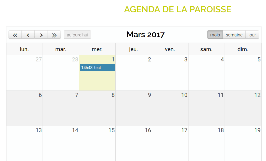 Notre événement apparaît désormais dans le bloc Agenda et renvoi dans le cas d’un événement lié, à l’article concerné. Les événements seuls ne pourrons pas être « cliqués » puisqu’ils ne sont pas liés à un article en particulier.